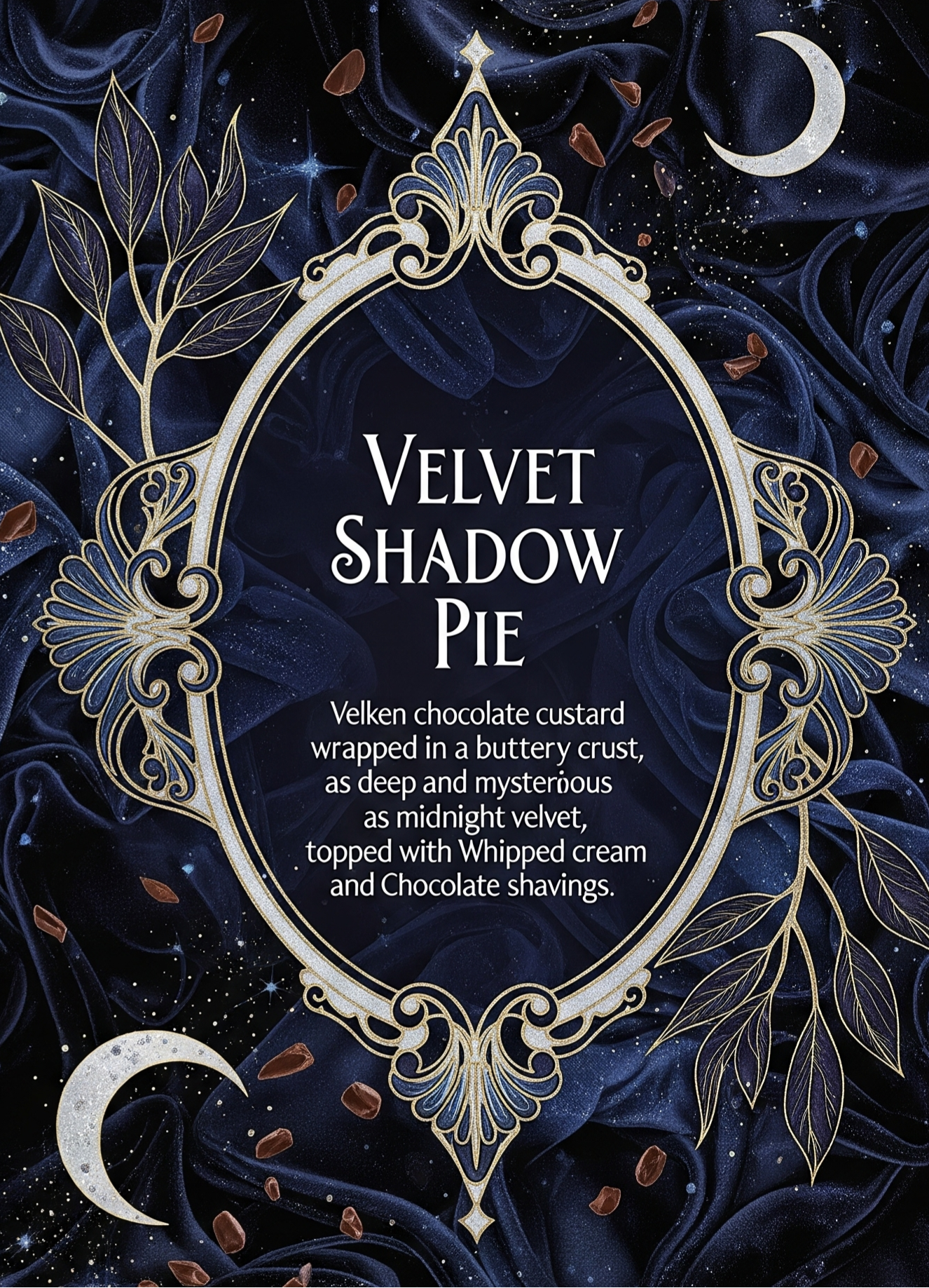 Silken chocolate custard wrapped in a buttery, flakey crust, as deep and mysterious as midnight velvet. Topped with whipped cream and Vahlrona chocolate shavings…and of course a sprinkle of magic…