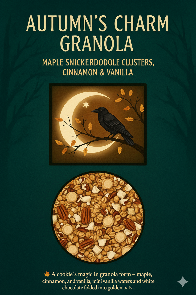 Clusters of oats baked golden with cinnamon-sugar, kissed with maple and vanilla, and folded with toasted pecans, mini vanilla wafers and white chocolate. As the winds change and leaves drift down, this granola carries the simple magic of freshly baked cookies in every bite. Wholesome enough for morning, sweet enough for midnight spells.