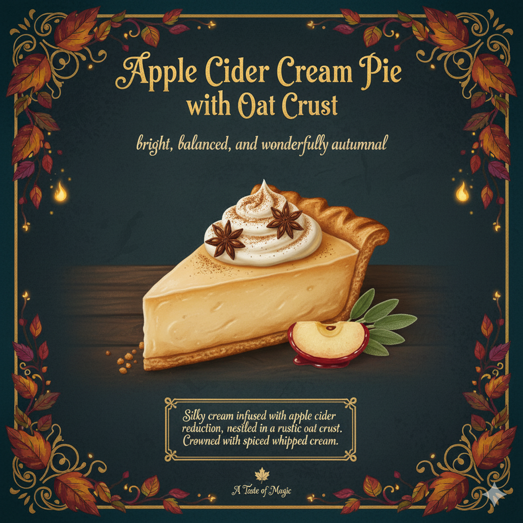 Silky cream infused with apple cider reduction, nestled in a rustic oat crust. Crowned with spiced whipped cream — bright, balanced, and wonderfully autumnal.