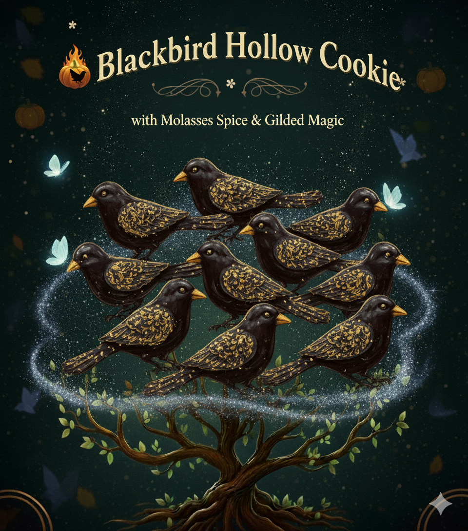 A signature blackbird-shaped molasses spice cookie, dipped in glaze and gilded with edible gold — a whimsical, spellbinding treat that captures the essence of Blackbird Hollow in every bite.