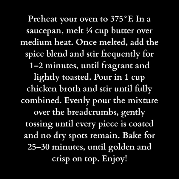 From the heart of Blackbird Hollow’s autumn kitchen comes a feast-day enchantment. Our Sourdough Stuffing Kit blends golden sourdough cubes with a fragrant spell of dried onion, celery, parsley, rosemary, sage, and garlic salt—each chosen to summon comfort and hearthlight. Simply stir in turkey broth and butter, then bake until the edges turn crisp and the air fills with the scent of home and harvest magic.
